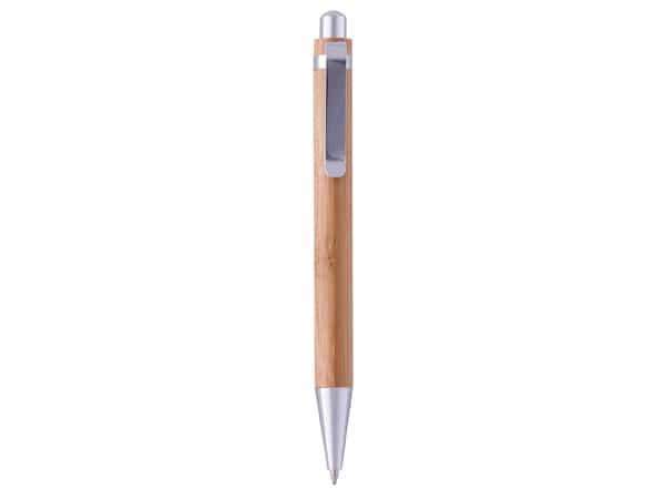 Bolígrafo cuerpo de bambú. Pulsador y puntera plásticos color plata. Clip metálico. Tinta azul.