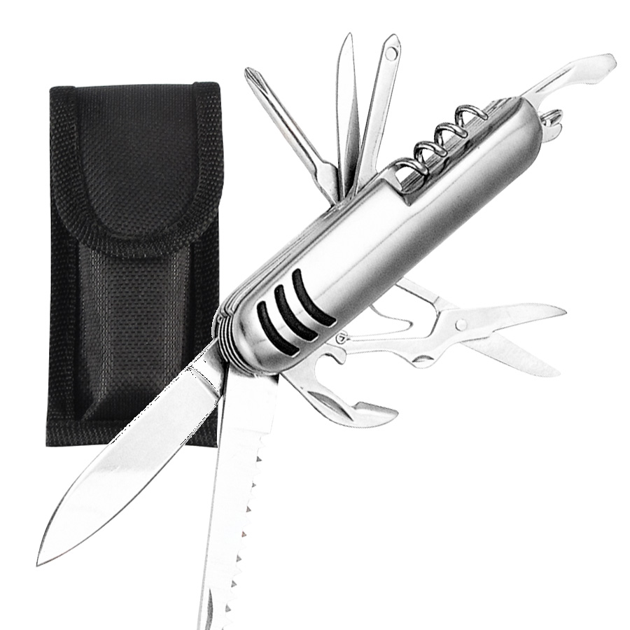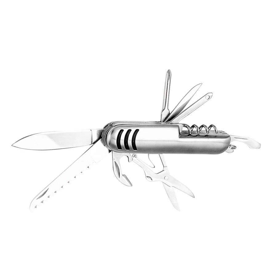 Cortaplumás 10-en-1 Tamaño:9 x 2.5 x 1.8 cm Colores: Plata Logotipo personalizable con: Serigrafía con calor, Pantógrafo, Grabado Láser