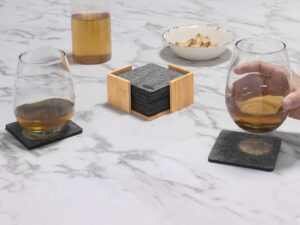 Posavasos De Rpet Koster Fieltro de plástico reciclado y Bambú. Set de 10 posavasos. El primero lleva impreso el sello RPET. Soporte de bambú de 10,5 x 10,5 x 5,5 cm Presentación en caja de regalo kraft.